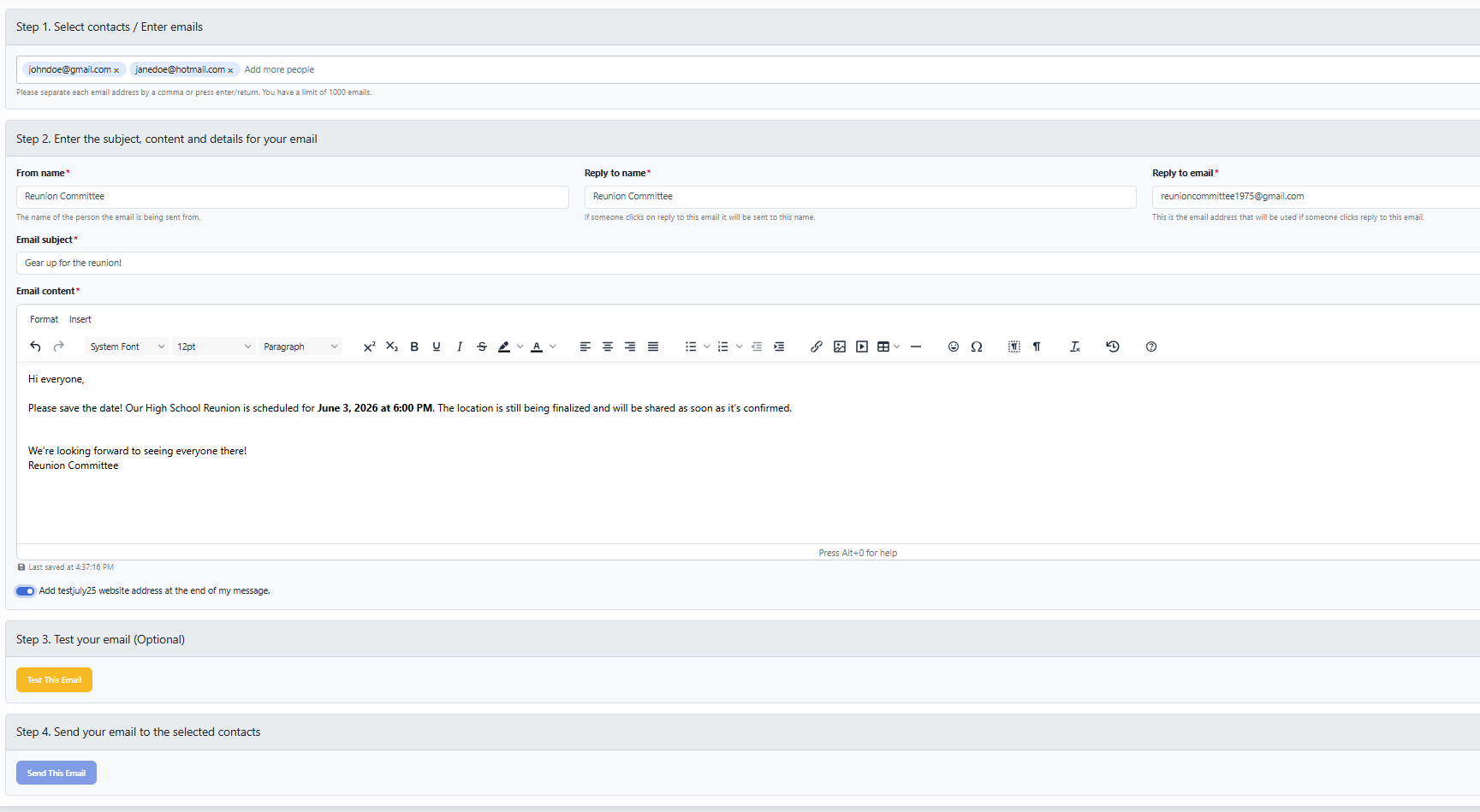 - Under Step 2, fill in a From Name, Reply to name, and Reply to email. Most likely, your own email, or if you have a special committee email to handle all things reunion, you can use that here.